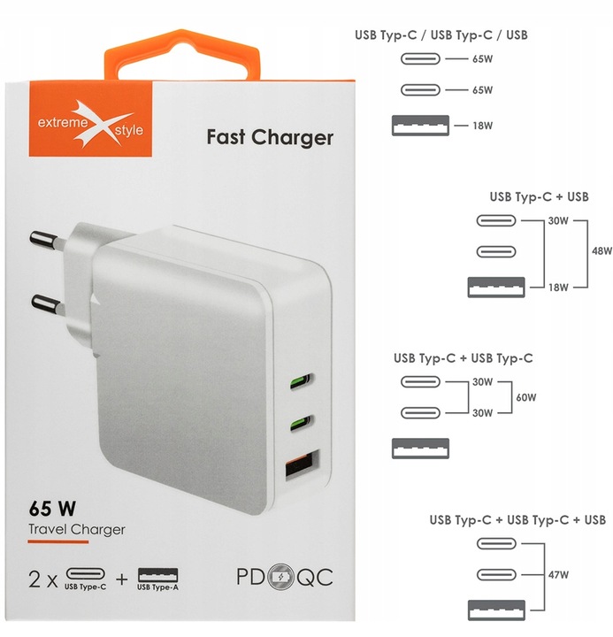 Ładowarka sieciowa 65 W - 2 x USB typ-C + USB - PD - SFC