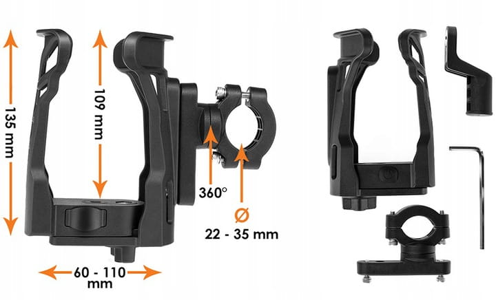 Dzięki uniwersalnemu mocowaniu, uchwyt nadaje się do motocykli, quadów, rowerów, skuterów, hulajnóg, wózków dziecięcych oraz wszelkich innych przedmiotów posiadających rurkę o średnicy od 22 do 35 mm.